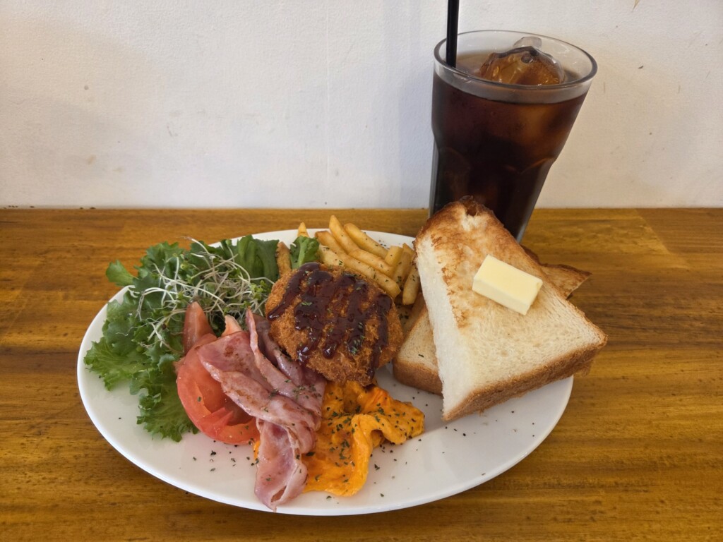クリームコロッケ、スクランブルエッグ、トマト、ベーコン、リーフレタス、フライドポテトにトースト。