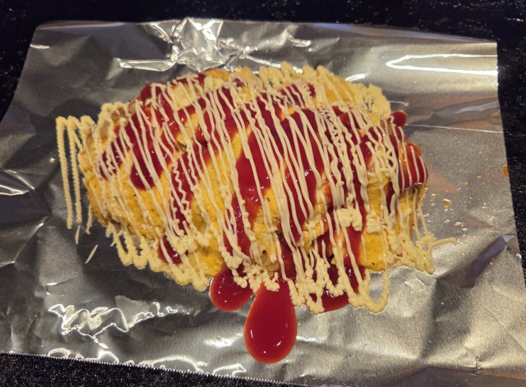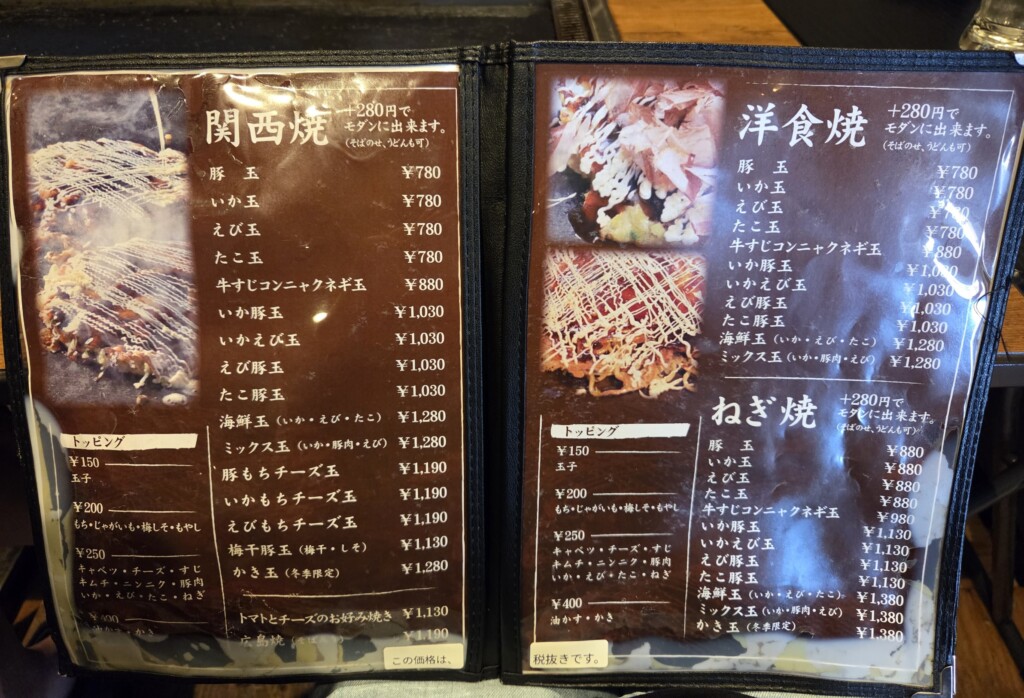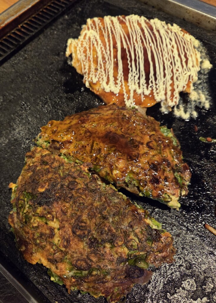ねぎ焼きと豚玉を注文。ねぎ焼きのソースは種類が選べてハーフにできるそうなので、ハーフにしてもらいました。