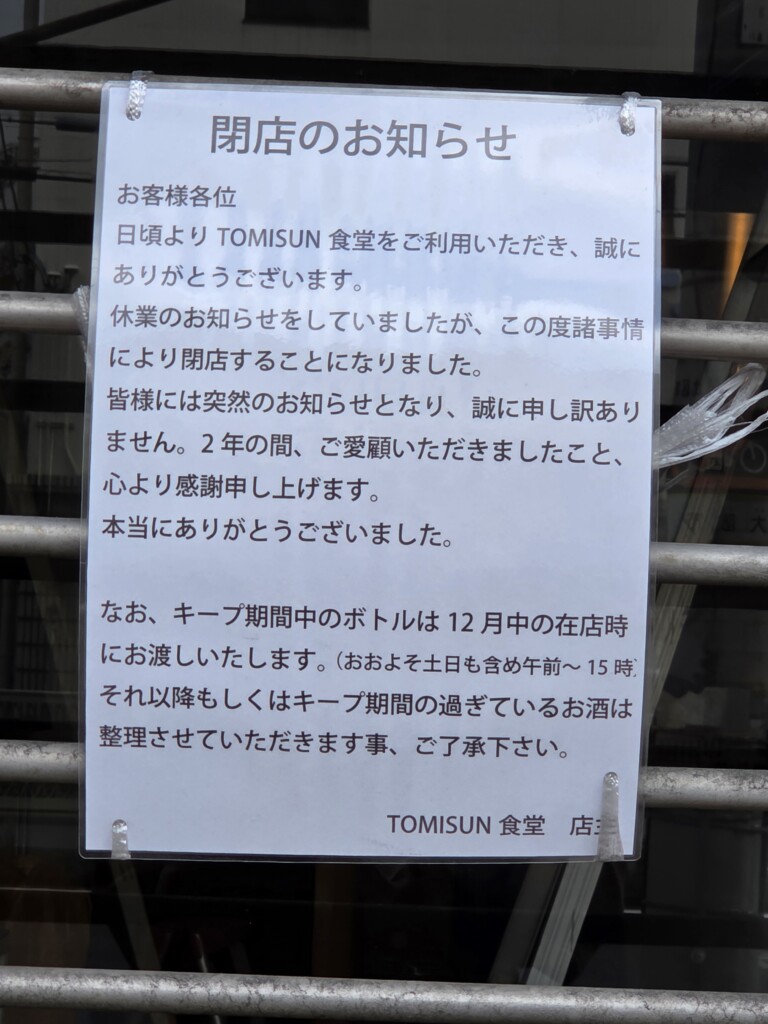 以前ご紹介した緑橋駅からすぐ近くにある『TOMISUN食堂』が閉店していました。