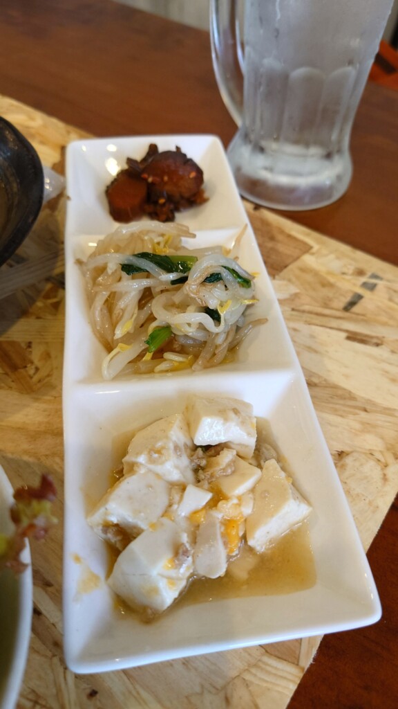 小鉢はしば漬け、もやしナムル、豆腐のなにかです。
