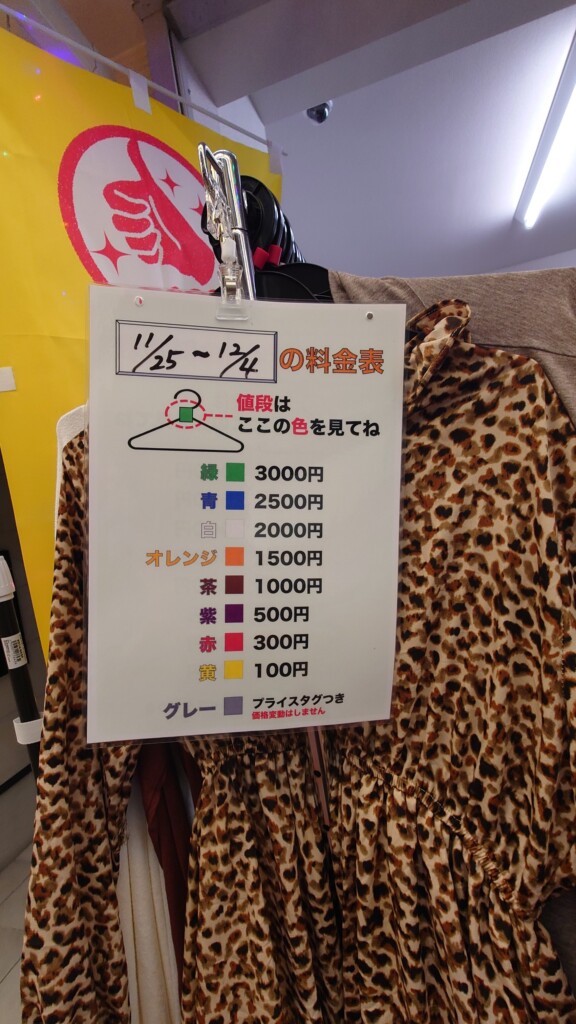 価格設定も分かりやすく、商品の値段はハンガーに付いているカラータグで見分ける仕組みになっています。無人でも安心して買い物ができる工夫がされている点が印象的でした。