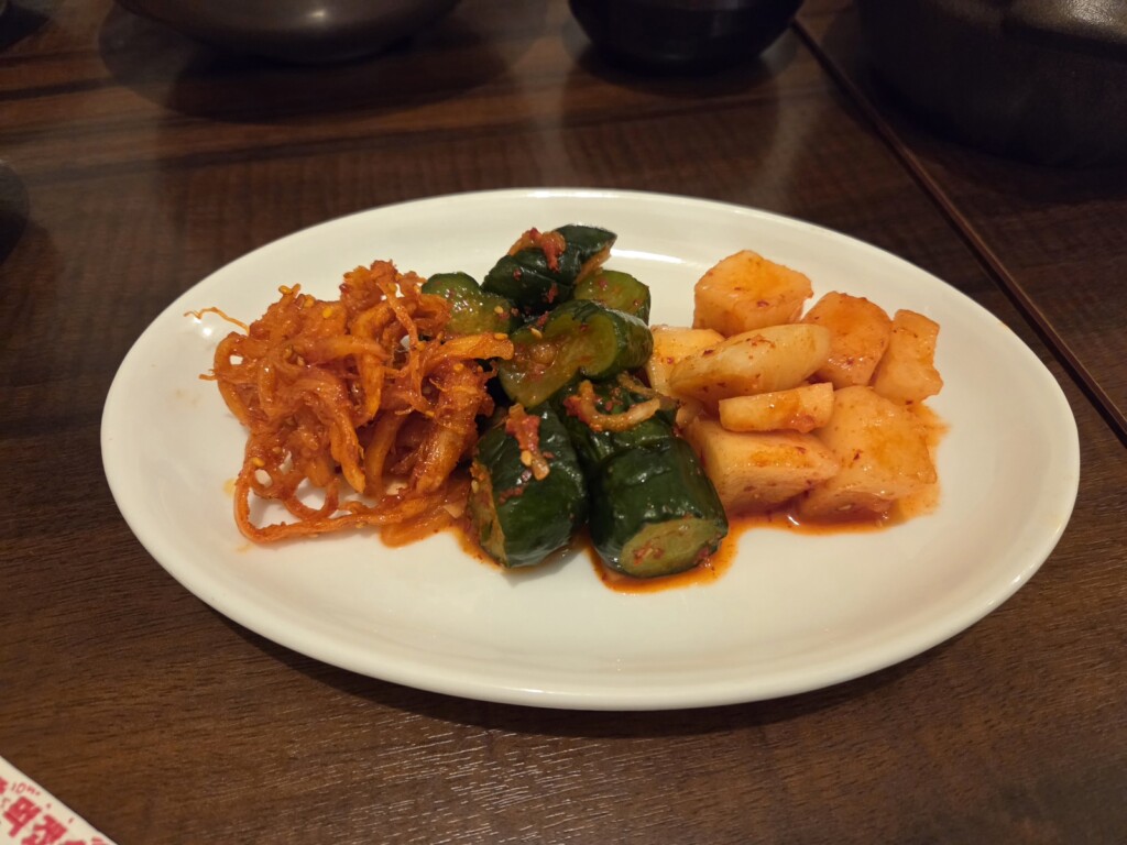キムチ盛り合わせ。白菜キムチもあると思ってたら、キムチは無料で食べ放題でした✌